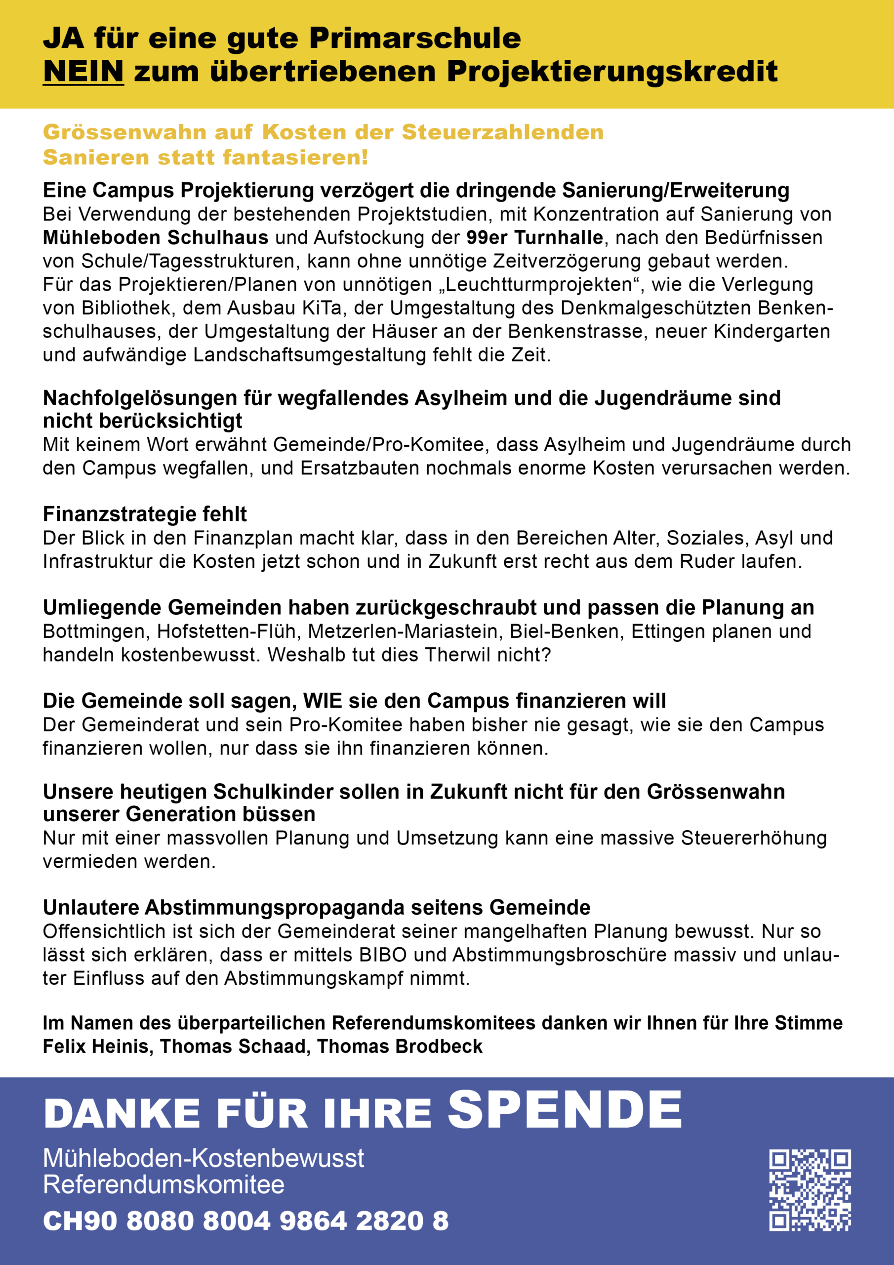 ÜBERPARTEILICHES KOMITEE FÜR EIN NEIN ZUM UNZWECKMÄSSIGEN CAMPUS MÜHLEBODEN PROJEKTIERUNGSKREDIT